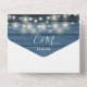 All in one wedding invitation featuring pretty string lights, signature style names and chic typography on a blue rustic wood background. The invitation includes a perforated RSVP card with meal choice. Designed by Thisisnotme©