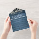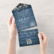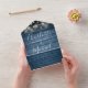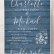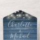 All in one wedding invitation featuring pretty string lights, mason jars, signature style names and chic typography on a blue rustic wood background. The invitation includes a perforated RSVP card with your wedding website QR code. Designed by Thisisnotme©