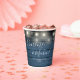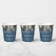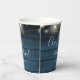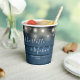 Elegant rustic wedding paper cup personalised with signature style names and your special wedding date on a string lights and blue wood panels background. Designed by Thisisnotme©