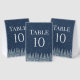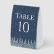 A beautiful table number card for your rustic winter wedding tables with a snow covered forest at night in navy blue and white.