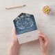 All in one wedding invitation featuring pretty string lights, hand-drawn floral garland and chic typography on a blue rustic wood panels background. The invitation includes a perforated RSVP card with your wedding website QR code and details. Designed by Thisisnotme©