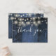 An elegant blue rustic barn wood string lights wedding thank you reception card, personalised with a special message and the bride and groom's names. Designed by Thisisnotme©