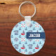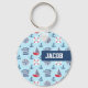 A cute key chain with various nautical items like sailboat with a tiny star, anchor, buoy, compass, a blue and white stripes tee. The colourful palette of red, white, blue with a light blue for background. Great for boys who love maritime or nautical themes. Personalise with child's name.