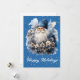 Unique Holiday card features a vintage-style santa in blue outfit with pretty winter floral and a starry sky background, Personalise your greeting with customisable text. This digital art design was created with the help of AI software.
