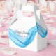 An image of a Blue coloured scarf draped across the front and sides of this White favour box with handle. Plain back. The front has personalised name which mingle in on the front with the image of the scarf. Sample text has Happy Birthday Martina shown. Customise this item if desired.