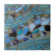 A turquoise blue mosaic with black, blue, light green, gold, grey, and white coloured sea glass.