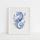 This elegant seahorse illustration captures the magic of marine life in delicate blue-and-white tones. The warm beige background enhances the detailed design, making it a standout piece in coastal bedrooms, bathrooms, or living spaces. Perfect for pairing with other marine prints, it adds charm and sophistication to ocean-inspired interiors.