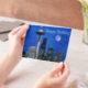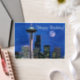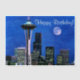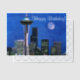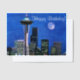 Blue watercolor version of the famous skyline of downtown Seattle, Washington under a full moon. Wishing you a happy birthday!