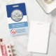 A blue shades box column design. At the top portion lies a dark blue semi circle frame that encapsulates a photo placard option ; This will help photos that have a white background. The photo size is 1,000 pix x 1,000 pix. Below the photo, in a blue column stripe, are your prestigious name and job title. At the base of the badge, is the optional healthcare logo which you can use with its organisation name and contact details.