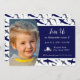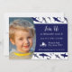 Add a touch of the ocean to the birthday party of your little boy with this custom blue and white shark pattern invitation. Invitation has cute sharks swimming in the sea and your little one's name, the event details, and space for a photo.