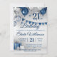A stylish design for a 21st birthday party invitation. Features blue and silver balloons and pennant with blue text. All text can be amended as needed