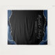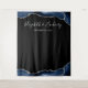 This elegant wedding photo booth tapestry features a navy blue and silver agate border at the top and bottom on a black background. Personalise it with the names of the bride and groom in pale silver grey handwriting font followed by the date.