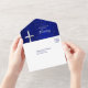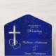 This pretty all season wedding invitation with tear away RSVP card in tones of silver and royal blue will give a sense of elegance to your wedding! The inside has a lovely silver cross with two silver hearts interlocked at its foot. There's a subtle silver confetti overlay to add a bit of sparkle. Your wedding text is also in silver at the right of the cross and hearts image. Everything is placed on a stunning royal blue gradient background. The bottom tear away RSVP portion has the swirl image continued, but is white to make it easy for your respondent to mark. If you don't need a text field, just blank it out, and if you need help organising different text, please contact us. We are always happy to help. If you're having a buffet reception, we can work with you to re-design the RSVP portion, so don't hesitate to ask! An added bonus and personal touch is your own photograph on the back flap.