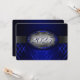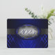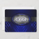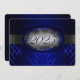 Blue and silver graduation party invitation with light and dark blue stripes and a silver ribbon going across showing the year of graduation. The back of the card is blue with light silver font for people to fill in the graduation party invitations.