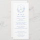 Monogrammed initials framed by elegant crest and hand illustrated botanical leaves, menu details in elegant script and classic font, simple and luxury.  Great blue and white menu for modern classic wedding, simple formal wedding, elegant botanical garden wedding.