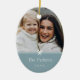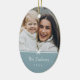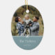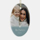 Sweet and simple oval-shaped Christmas photo ornament features a minimalist layout, with your family name and the year in clean, classic serif typeface on a soft blue background. A petite bow beneath your photo completes the design.