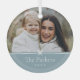 Sweet and simple Christmas photo ornament features a minimalist layout, with your family name and the year in clean, classic serif typeface on a soft blue background. A petite bow beneath your photo completes the design.