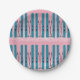 Blue skis on snow with pink background paper plates. Fun party decor for a winter or ski celebration.