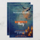 The word "Halloween" is prominently displayed in a dripping orange font, providing a bold and festive contrast against the serene blue sky. The rest of the font in orange and white complements the design while keeping the party details clear and easy to read. The back of the invitation mirrors the same beautiful sky and festive scene, giving the invitation a cohesive and polished look. This invitation is perfect for setting the tone for a Halloween party that’s fun, festive, and just a little spooky!