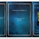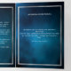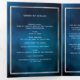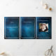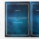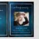 An elegant tri-fold program. A dark blue sky as background, faux silver frames and space for a photo. Personalise and add name, dates and your text. White text.