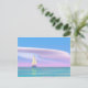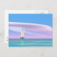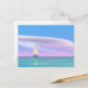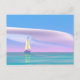 Postcard with my digital artwork of a sailboat on tranquil turquoise water with wavy clouds, blue sky and pink horizon.