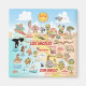 A spectacular view of Southern California - wacky characters frolic on the beach and desert of SoCal showcasing Los Angeles, Santa Barbara, San Diego, Riverside, Palm Springs, Anaheim, Anza Borrego and Joshua Tree parks as well as the border cities of Tijuana, Tecate and Mexicali. This charming scene has it all – a surfer hangs ten while a mermaid lounges on a rock, a killer whale leaps out of the water, zoo animals greet the tourists, a muscular beach couple both flex to impress as a T-Rex roars a challenge and a tank rumbles into position and much more…