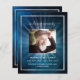 An elegant 2-page program. A dark blue sky as background, a faux silver looking frame, and space for a photo. Light beams behind the photo. Personalise and add name, dates and your text.