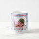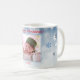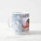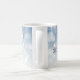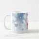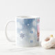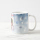 Blue snowflake minimalist red-letter coffee mug with photo. This is a mug that features a striking red letter design along with a photo.