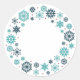 A festive design for the holiday season with round wreath of blue snowflakes on white background.