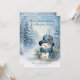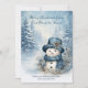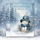 From Our House to Yours - A softly illustrated winter scene features a charming snowman dressed in cozy shades of blue, standing among snow-covered evergreen trees as gentle snowflakes and sparkling lights drift through the air. Delicate winter foliage surrounds him, and the cool, peaceful palette of icy blues and whites creates a calm, nostalgic holiday atmosphere. The glowing snowfall and serene forest setting evoke comfort, joy, and heartfelt connection, making this image a timeless expression of the magic of Christmas. Personalize with your own information.