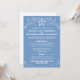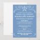This wedding invitation is light blue with white calligraphy ornaments and white text. Customise the star in the header with the initials of the future bride and groom.