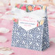 A modern classic wedding favour box design featuring a background of dark blue and white vintage tiles. This dark blue is the perfect colour to show off vibrant pink watercolor flowers, and orange citrus fruits.