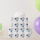 Wrapping paper with a cute stick figure cheerleader in a white and blue uniform with blue pom poms.