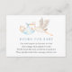 A book request insert card for baby shower. Featuring a watercolor stork carrying a baby wrapped in a blue blanket with poem: "ONE SMALL REQUEST, WE HOPE NOT TOO HARD