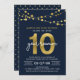 Elegant 10 Year Class Reunion invitation featuring strings of lights and "10" in faux gold foil with "year reunion" in white against a dark blue background on the front and a dark blue and faux gold polka dot pattern back side. Check out other matching items here https://www.zazzle.com/collections/school_reunion-119258151199573326?rf=238364477188679314