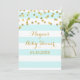 Personalised baby shower invitations in baby blue and white stripes pattern with gold confetti, please note gold is photographic effect only.