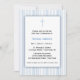 First Holy Communion invitation with blue and white striped border and small blue cross.