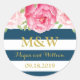 Wedding monogram favour tag stickers in navy blue and white stripes pattern with pink watercolor flowers and gold colour text. A great way to decorate wedding favours.