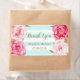 Wedding thank you labels in light pastel turquoise sky blue and white stripes with vintage pink watercolor flowers and gold colour text. Perfect for wedding favours or as wedding wine bottle labels.