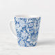 A latte coffee mug with a William Morris (18134-1896) floral pattern entitled Sunflower (1879) in a classic blue and white palette. Large sunflowers with graceful grape vines and leaves. He was a British artist during the arts and crafts period, who designed wallpaper and textiles.