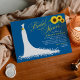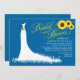 Elegant bridal shower invitation for the stylish bride-to-be features an ornate calligraphy script font and flowing wedding gown with sunflower detail. White, cobalt blue, green, yellow, and brown design colours.