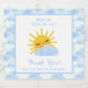 Send your baby shower guests home with this adorable and sweet blue and white abstract clouds custom mini sparkling wine bottle label that reads "Pop it when she pops!" The label is customisable, to edit the text click "personalise this template". This custom sparkling wine label features a hand drawn textured cloud pattern background and a hand drawn illustration of a smiling yellow sun peeking out from behind a fluffy cloud. This makes for a fun and unique baby shower party favour and take home gift!