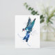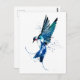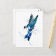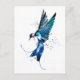 a traditional watercolor animal artwork featuring a swallow bird flying around in surreal blue and turquoise colours on a postcard.