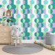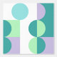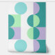 This design showcases a modern geometric pattern with circles and half-circles in shades of seafoam teal blue, light green, and violet purple against a white backdrop. It's an elegant and stylish design that embodies eclectic minimalism, perfect for artistic interior designers, decor enthusiasts, trendsetters, and fans of vintage retro or abstract digital geometric motifs. This ornate yet funky hipster pattern is versatile, available on a variety of contemporary home decor items, making it suitable for enhancing the ambiance of spaces such as master or children's bedrooms, kitchens, nurseries, living rooms, woman caves, college dorms, condos, studios, or apartments.