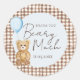 Add a sweet finishing touch to your celebration with this We Can Bearly Wait Boy Baby Shower Round Sticker. Featuring the collection’s signature light blue and brown watercolor gingham plaid pattern, a watercolor teddy bear holding a blue balloon, and playful text that reads Thank You Beary Much, this trendy design is perfect for tying your theme together.