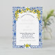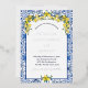 Personalise this beautiful Mediterranean Italian Wedding Invitation and set the tone for your dream destination wedding with this elegant design inspired by the charm of the Amalfi Coast. A vibrant arch of yellow lemons intertwined with lush greenery creates a stunning focal point, beautifully complementing a classical blue and white Italian tile border. The invitation features a blend of modern and script fonts in navy blue and shimmering foil against a crisp white background, capturing the essence of a romantic summer wedding. Perfect for couples celebrating love with a touch of Mediterranean citrus fruit elegance.