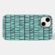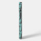 This phone case has a geometric design of tiles with rhombus shapes in light blue on a field of gray.