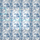 An intricate blue and white toile pattern featuring winding branches, blooming flowers, and delicate leaves in a traditional vintage engraving style.