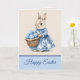 This charming Easter card features a "mother" rabbit in a toile, or Chinoiserie, style blue and white dress holding a basket of blue and white decorated eggs. The card says "Happy Easter" on the front, and "Wishing you a basketful of warm wishes for the Easter season." The inside also has a basket of eggs on the left. You can edit the text or make other changes if you wish.