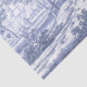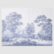 Vintage French illustration of a blue toile pastoral scene with a bridge and a couple in a rowboat.